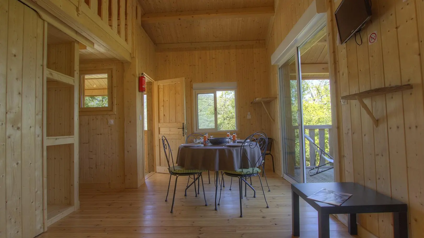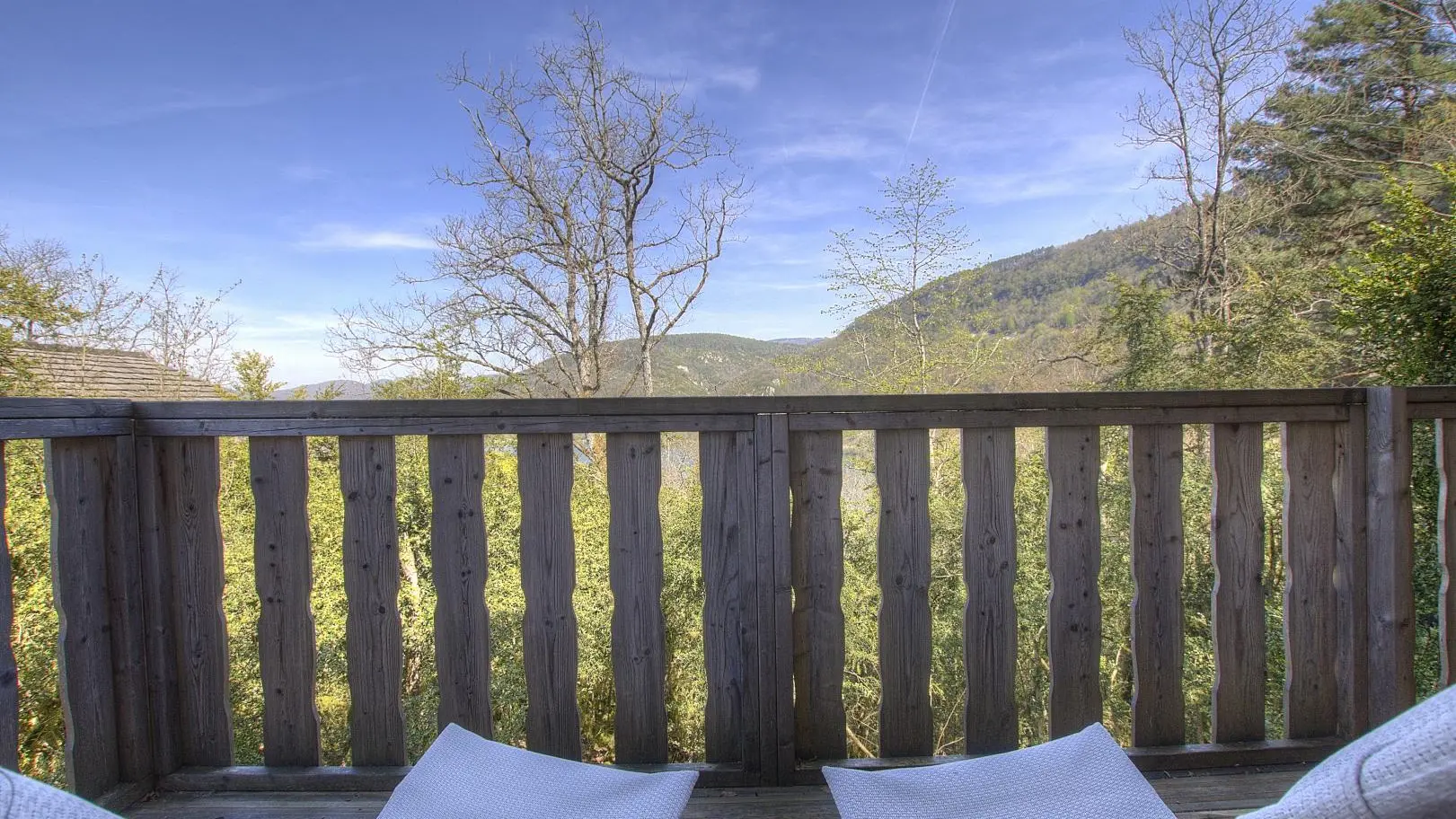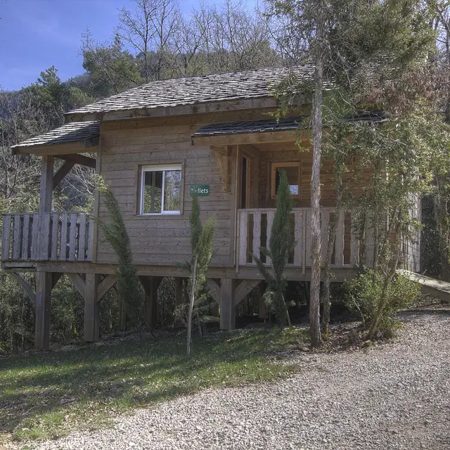 En haut de la colline, se dresse cette 7ème lodge de 50m² qui a la particularité d'être sur 2 niveaux. Vous accédez au Taillet par une "passerelle de plein pied", vous amenant sur l'intérieur de la lodge.