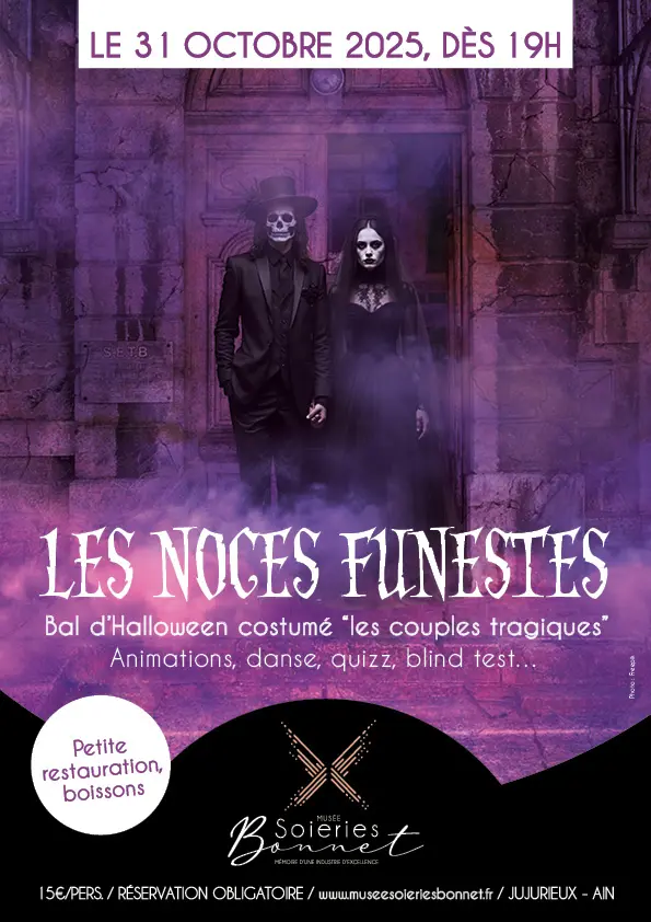 Pour clôturer en beauté l’exposition MARIAGE !, les Soieries Bonnet vous invitent à un bal des couples maudits ! Plongez dans une nuit de noces horriblement inoubliable avec horror blind test, quizz ensorcelé, danses macabres et concours du plus beau couple tragique. Venez déguisés sur le thème des couples tragiques et laissez-vous emporter par l’ambiance sombre et festive d’Halloween.