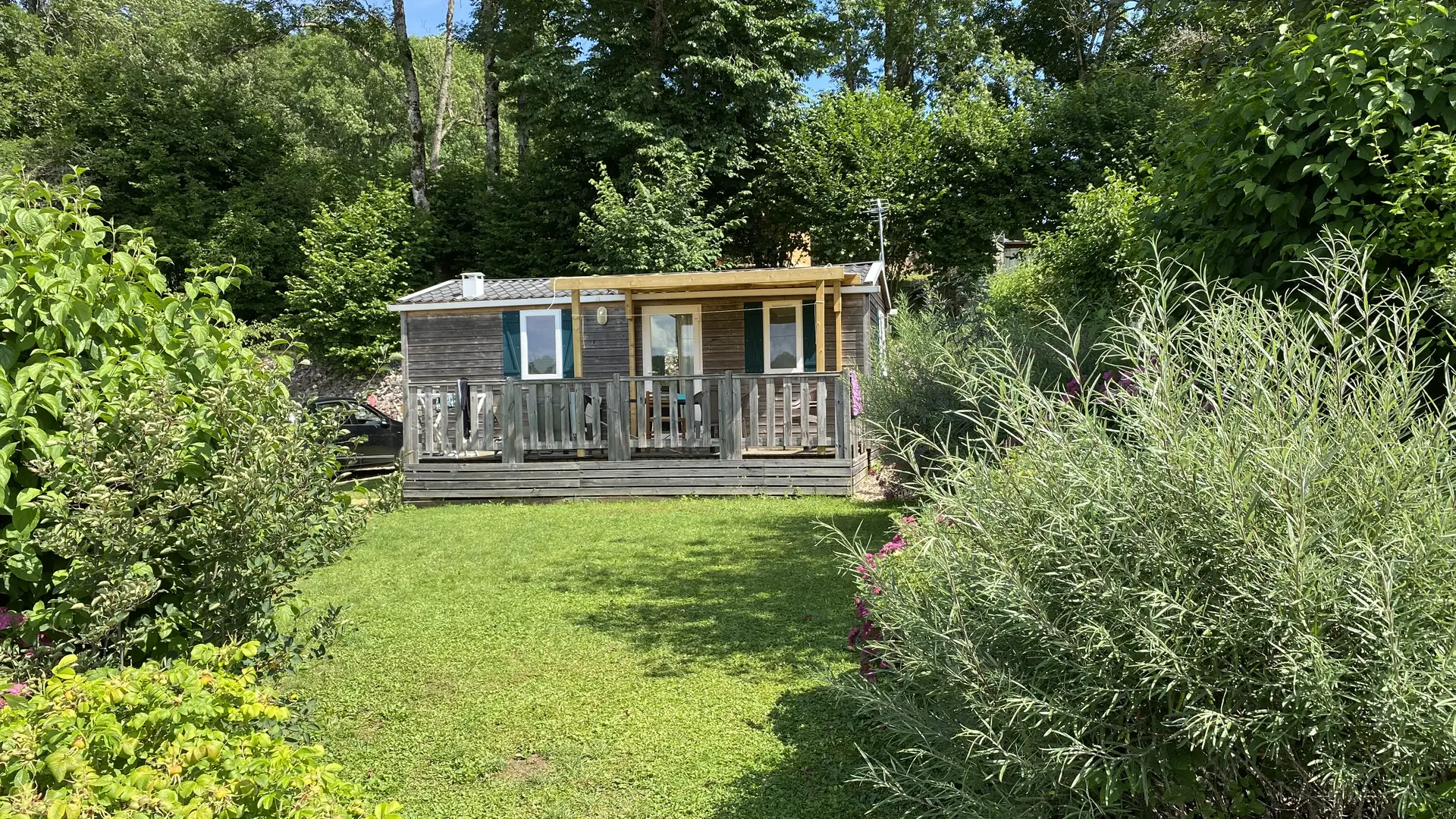 2 Mobiles home extérieur en bois. Modèles IRM Super Mercure, deux chambres, wc indépendants, isolation et chauffage renforcés. Equipement complet, micro-ondes, plaques de cuisson à gaz, réfrigérateur et télévision .Terrasse 15m2 semi-couverte. Wifi accessible.