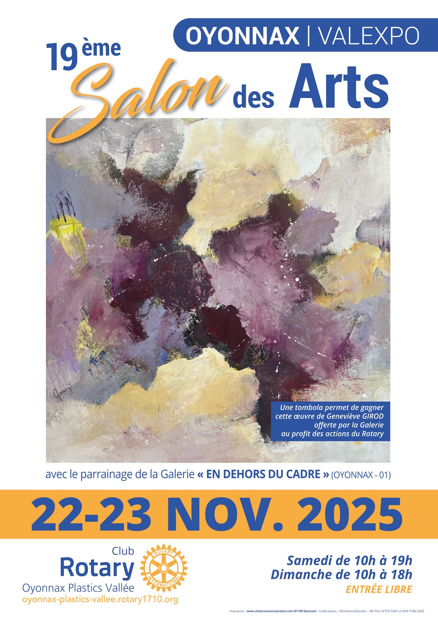 Le Rotary club d'Oyonnax organise le 19-ème Salon des Arts, avec des artistes locaux et internationaux. Avec le parrainage de la galerie "En Dehors du Cadre"