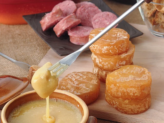 Dans les fermes autour de Saint-Rambert-en-Bugey, on ne jetait rien qui puisse se manger ! Un petit fromage fabriqué à partir du babeurre, ce qu’il reste du lait de vache une fois écrémé, a ainsi vu le jour. Destiné à la consommation locale, ce fromage confidentiel d’environ 7 cm de diamètre, translucide et de couleur ocre, est un plat traditionnel et convivial qui se déguste sous forme de fondue (fromage fondu en patois), contenue dans un ramequin d’où il tire son nom.