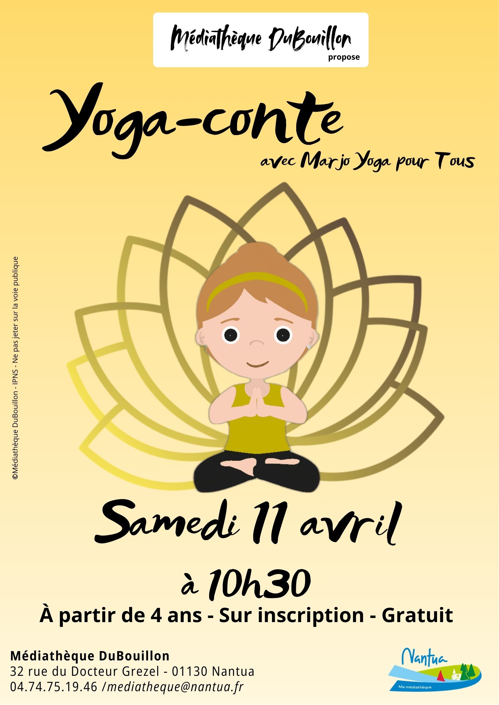 Samedi 11avril, à 10h30, venez vous détendre lors d’une séance de yoga, animée par “Marjo Yoga pour Tous” et profitez d’un temps de lecture avec nos bibliothécaires.